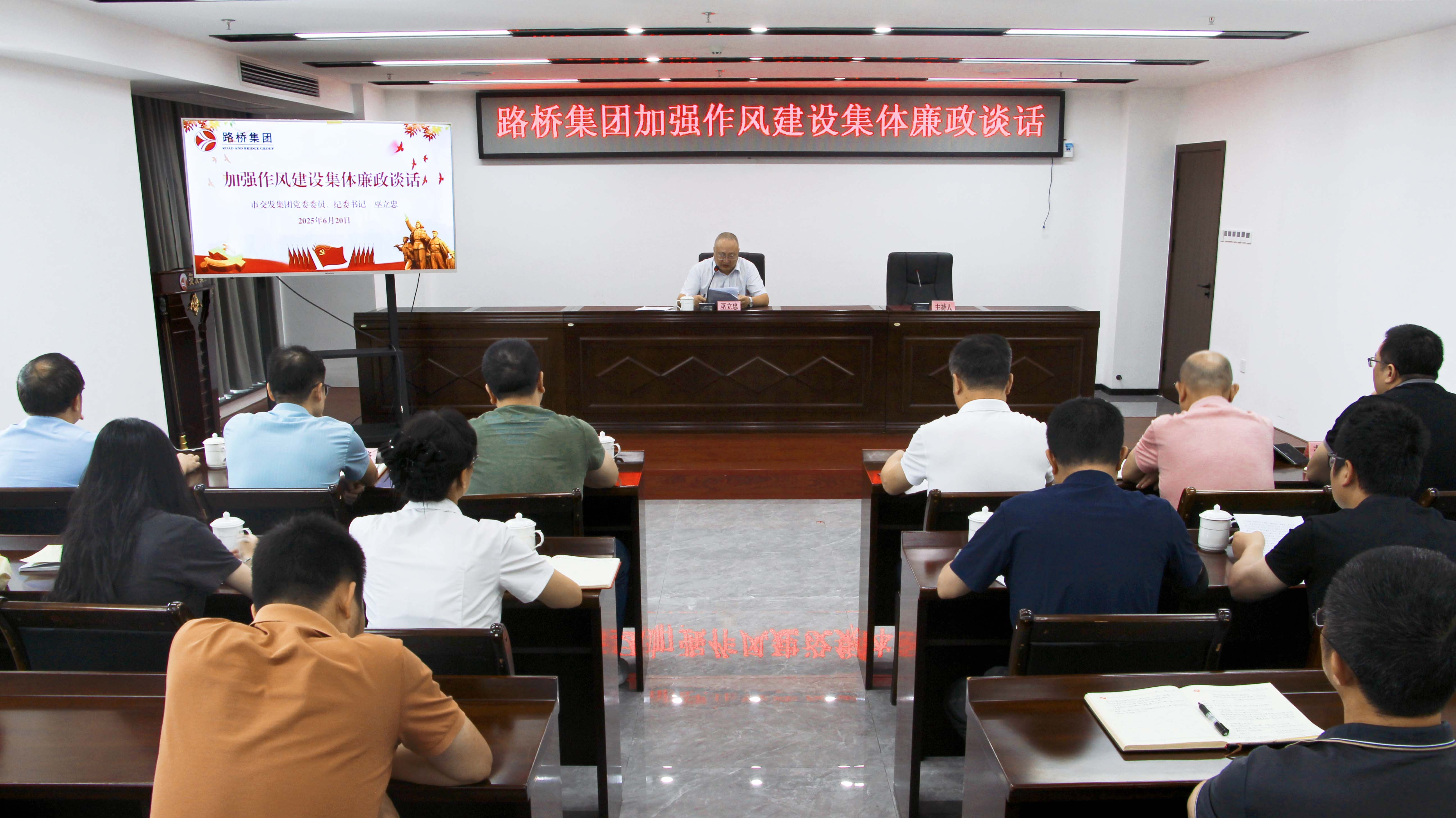 為深入貫徹落實(shí)全面從嚴(yán)治黨要求,持續(xù)推進(jìn)深入貫徹中央八項(xiàng)規(guī)定精神學(xué)習(xí)教育,6月20日,市交發(fā)集團(tuán)黨委委員、紀(jì)委書記巫立忠在路橋集團(tuán)開展學(xué)習(xí)教育督導(dǎo)講話暨加強(qiáng)作風(fēng)建設(shè)集體廉政談話,路橋集團(tuán)黨委書記、董事長周家興主持會(huì)議。市交發(fā)集團(tuán)紀(jì)檢監(jiān)察部、路橋集團(tuán)領(lǐng)導(dǎo)班子成員、機(jī)關(guān)部門人員及權(quán)屬公司負(fù)責(zé)人參加會(huì)議。