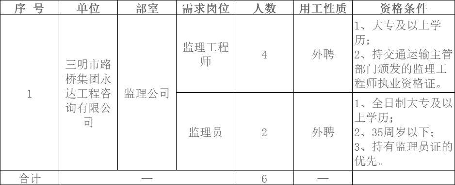 (一)公告。招聘崗位、人數(shù)、任職資格等信息在 “三明市路橋集團”官網(wǎng)(m.cqszmy.cn)及“一覽監(jiān)理英才網(wǎng)”官網(wǎng)(http://www.jljob88.com)向社會統(tǒng)一公告。