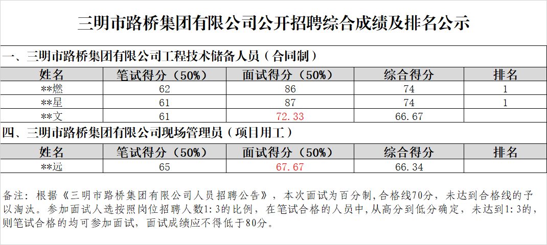 根據(jù)《市路橋集團(tuán)有限公司人員招聘公告》,現(xiàn)將市路橋集團(tuán)有限公司公開招聘工作人員綜合成績及排名情況公示如下: