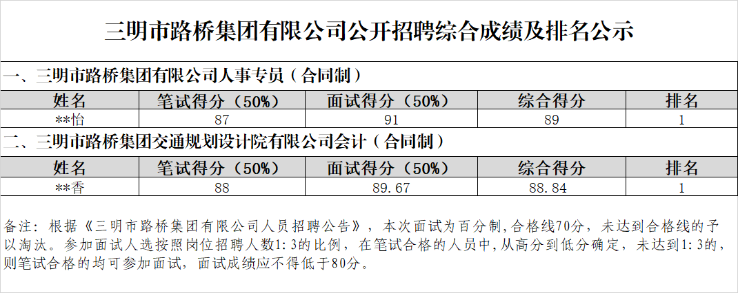 根據(jù)《市路橋集團有限公司人員招聘公告》,現(xiàn)將市路橋集團有限公司公開招聘工作人員綜合成績及排名情況公示如下: