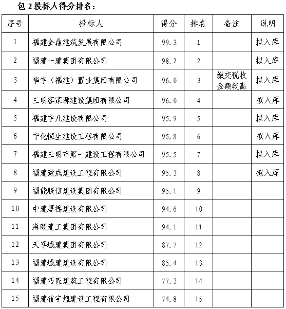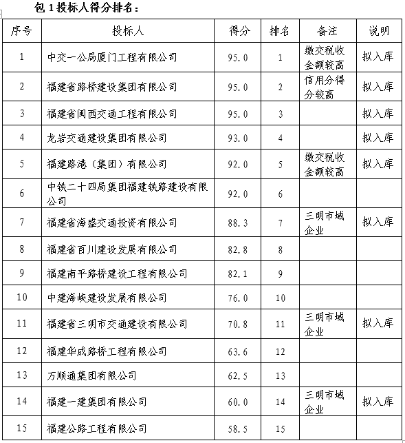 評標委員會對通過資格審查的各合格投標人,按合同包根據(jù)遴選文件規(guī)定進行評分。各投標人經(jīng)評標委員會綜合分析、比較,在全部滿足遴選文件實質(zhì)性要求前提下,按得分從高到低的順序進行排名,排名最高的前8名投標人將被推薦為相應合同包的入庫候選人;具體為:包1為公路工程類,排名前3名的三明市域企業(yè)和三明市域企業(yè)外排名前5名的企業(yè)入庫。包2為房建工程類,排名前8名的三明市域企業(yè)入庫;若企業(yè)得分相同,則以企業(yè)信用分得分高的排名優(yōu)先。再相同的,依次以業(yè)績得分、資質(zhì)得分、繳交稅收金額高的排名優(yōu)先。