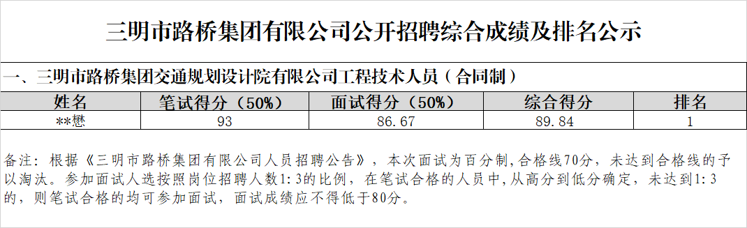 根據(jù)在三明市人力資源和社會(huì)保障局、三明市人民政府國有資產(chǎn)監(jiān)督管理委員會(huì)、三明市殘疾人聯(lián)合會(huì)聯(lián)合辦法的2025年三明市“職通未來?才聚三明”專場招聘會(huì)上發(fā)布招聘公告,現(xiàn)將市路橋集團(tuán)有限公司公開招聘工作人員綜合成績及排名情況公示如下: