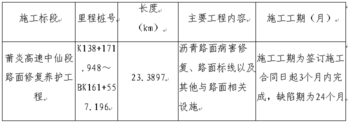 本遴選項目莆炎高速中仙段路面修復(fù)養(yǎng)護工程勞務(wù)協(xié)作建設(shè)資金來源為業(yè)主支付款,遴選人為三明市路橋集團昌盛公路工程有限公司。本項目已具備遴選條件,現(xiàn)對該項目進行庫內(nèi)遴選,并向三明市路橋集團有限公司工程施工勞務(wù)班組庫(公路工程類)內(nèi)單位以電子郵件形式發(fā)出通知。